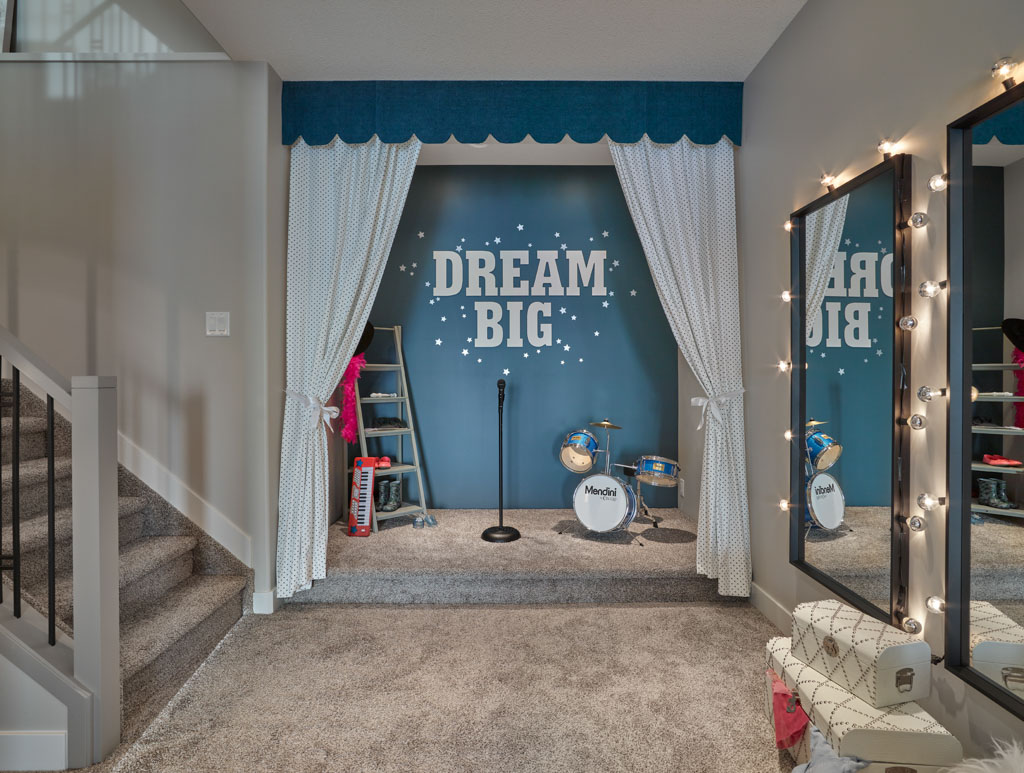 In this beautiful showhome, the client desired something colorful, rich, and slightly more traditional. So we created an inviting atmosphere by using earthy tones with pops of color like aquamarine, yellow and rich reds throughout different rooms while delivering a classic chic vibe through eye-catching art pieces.